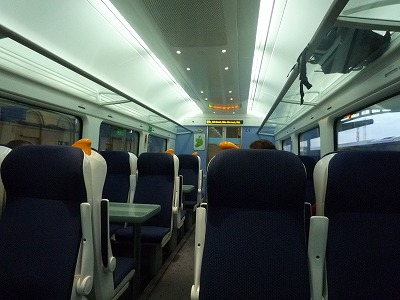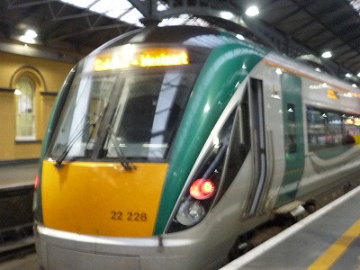 7:30にダブリンのヒューストン駅発の電車に乗って約3時間、ゴールウェイ→アラン諸島(イニシュモア島)へという行程です。ゴールウェイまでの車内は、同じツアーに参加する人+ゴールウェイ周辺の周遊ツアーに参加する人と一緒で、ツアー会社のガイドの人や他のツアー客と一緒に歓談しながらの旅になりました。もちろん積極的に会話に加われるほど英語しゃべれないので引きつった笑い浮かべながら聞いてるのが主だったけどね!(一人だったのでガイドさんが気にかけてくれましたが、たぶん誰かと一緒だったらそんなにかまわれることもないかと思う) 1等車でもないのに車内が大変綺麗だったのがすごいなぁと思いました。なんか、だいぶ前に乗った某国の一等車より綺麗だよこれ!目から鱗でございます。