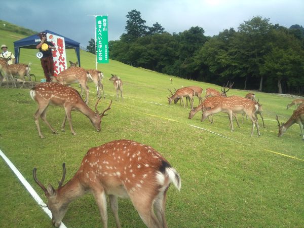 若草山でやっていた鹿せんべい飛ばし大会なるものにチャレンジしました。