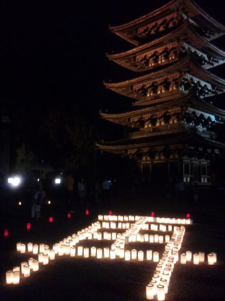 興福寺のライトアップに、春日野園地の一面の明かり、そしてたぶんスマイルマーク。