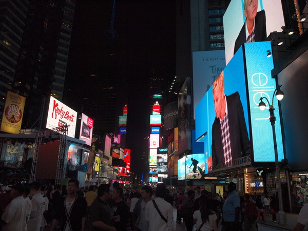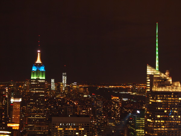 おおてれびでみたことあるー!というブロードウェーを見て、高いビルに登りに行きました。歩いていける距離だったというのと、並ぶのが面倒臭かったというのと(エンパイアステートビルはいつも並んでいるらしい)入場料が若干安かったというのとで、27ドルでトップ・オブ・ザ・ロックに登りました。時間指定のチケットを買うので混んでいるとすぐに入れないらしいのですが、特に混雑することなく21:25入場回のチケットを購入し、黙々と登っていきます。これ、途中で窓ガラス越しにきれいな夜景が見られるのでそこでついつい立ち止まってしまうのですが、そのあたりはさくっと無視してさっさと最上階(屋上)まで行ったほうがいいです(案の定最初のあたりですごーいと思って写真をたくさんとってしまったけど、更に上に行くと直に夜景が見られてもっときれいだった)。ここからだとエンパイアステートビルが見られるのが醍醐味ですね。周りに一人の人ほとんどいなくて、なんか寂しい気分になったのは気のせいだと思います。たぶん。私はカメラマンじゃ、な、い……(いろんな人に写真を撮ってくれと言われた)。