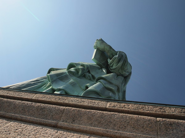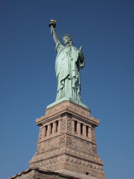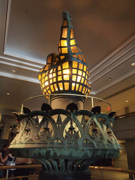 ということで自由の女神の真下まで。そしてそのあと台座まで(王冠までのチケットはさすがにさっさと売り切れていたので)(おふねの往復料金=お船+台座までの料金だったのでとりあえず台座までのチケットを買っておこうと)。台座の中に自由の女神博物館があって、自由の女神建設の足跡や、初代トーチなんかが飾ってありました。