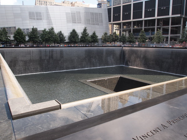 倒壊したビル2つがあったところは、水が流れ落ちる深い追悼碑。