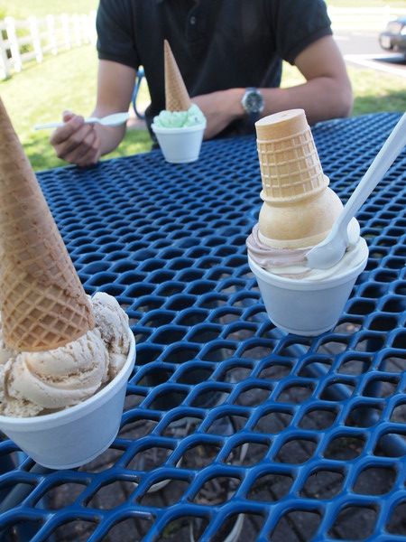 ついていっただけなのでお店の名前も場所もよーわかりませんが、大草原の中に突如として現れるアイスクリーム屋さん(夏季限定)。私はめっちゃオーソドックスにメープルシロップとナッツのアイスを食べまして、美味しかったです(一番手前)。その隣はバニラとチョコのソフトクリーム。こっちも美味しかったです。一番奥の怪しい緑色はピスタチオのアイスなのですが、これはいまいち……見た目は味を裏切らないね!