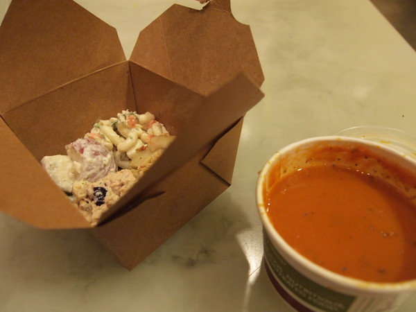 時間節約のため、到着した日はユニオンスクエアのホールフーズマケートでデリを買って、中で食べるところがあったのでそこで食べました。割といいおねだんします(量り売りで、サラダっぽいのとスープとで10ドルくらい)。でも美味しかったです。味濃いけど。