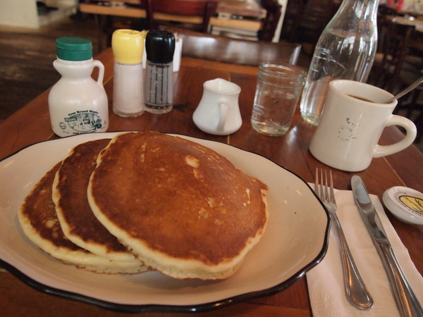 よくわかんなかったので、ひとまずパンケーキとケーキを頼みました。でかいです。大きいです。一人でこれは結構きつかった……!けれども美味しかった!ふんわりでした。右のほうの小さいお皿がバターで、メープルシロップをつけていただきます。コーヒーと合わせて30ドル弱くらいでした。