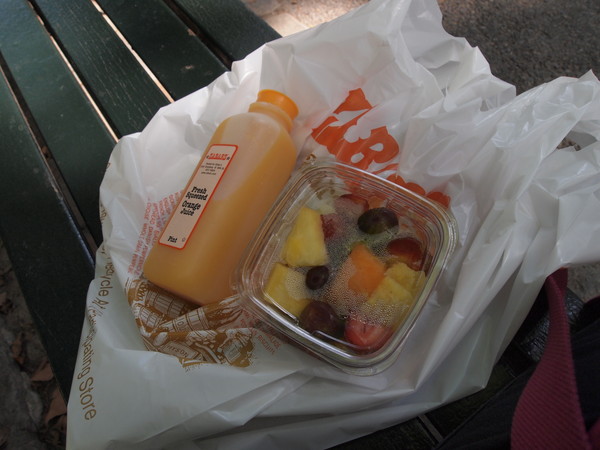 で、自由の女神を見た日のお昼ごはん。79丁目駅近くのゼイハーズでフルーツセットとオレンジジュースを買いました。本当はここのスモークサーモンのベーグルサンドセットを食べたかったのですが、このあたりから胃に来ておりまして。アメリカではどこのスーパーでもだいたい「フルーツ盛り合わせ」が売ってあることを教えてもらっていたので、これはいい胃休め。セントラルパークで食べていたんですが、ちょうど目の前でジャズのセッションが行われてて、なんか得した気分でした。