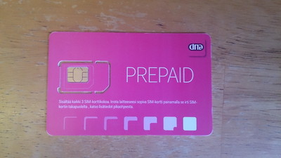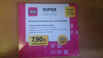 買ったのはdnaのSuperPrepaidというやつです。21 Mbit/s Internet for max. 1,92 €/day while active users can purchase data packages starting at 4,90 € including 100 MBというようなサービスです(必要そうなところを抜き出した)。