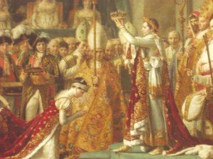 そして、そこから一行は2グループに。 ゆっくり美術館を楽しむ組と、とにかく完全コンプリートを目指す組。 ふたりという少数精鋭の我が完全制覇組は、奴らを置き去りに、とにかく歩いて歩いて歩きまくりました。 そして、ちらりと何気なく見たものの中には、きっとミケランジェロとかの大物の作品もあったのでしょう。 残念なことに、ルネサンスのコーナーは全面封鎖されていて見ることができなかったのですが、なんとか全部見ました。 やっぱり、教科書に出てくる絵を間近に見る、というのは興奮します。 お気に入りは、ナポレオンとかそこら辺のあれ。 ナポレオン戴冠式の絵は、大きい大きいと聞いていたけど、あそこまで大きいとは思わなんだ。ということで、真ん中だけ撮ってきました。 |